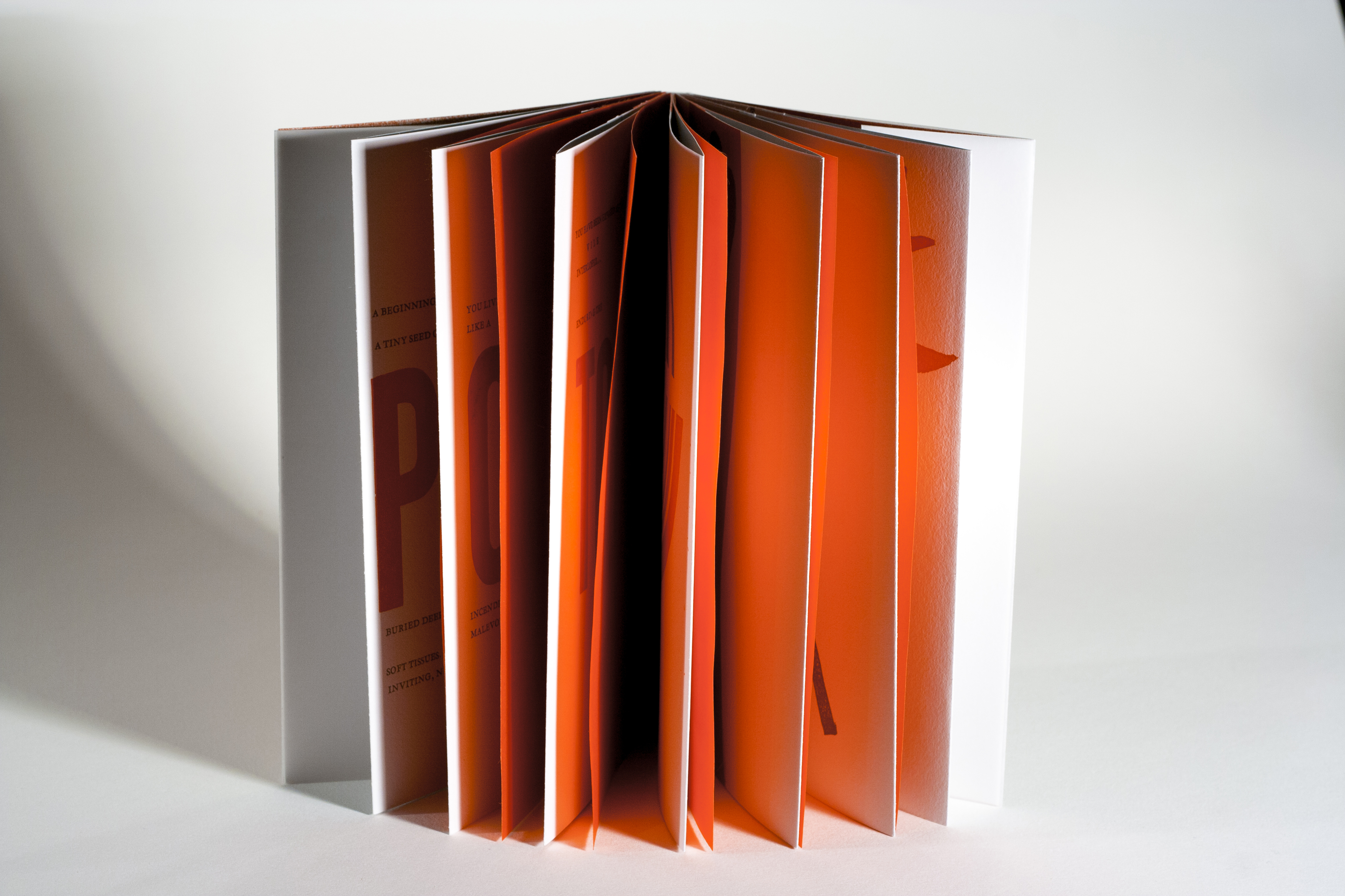 A mixed media 5x7 book written, designed, illustrated and printed by me using letterpress, linoleum cut illustrations, and hand lettering. Hand bound in accordion style with a wrap-around dust jacket and a hand lettered, transparent dust jacket overlay.