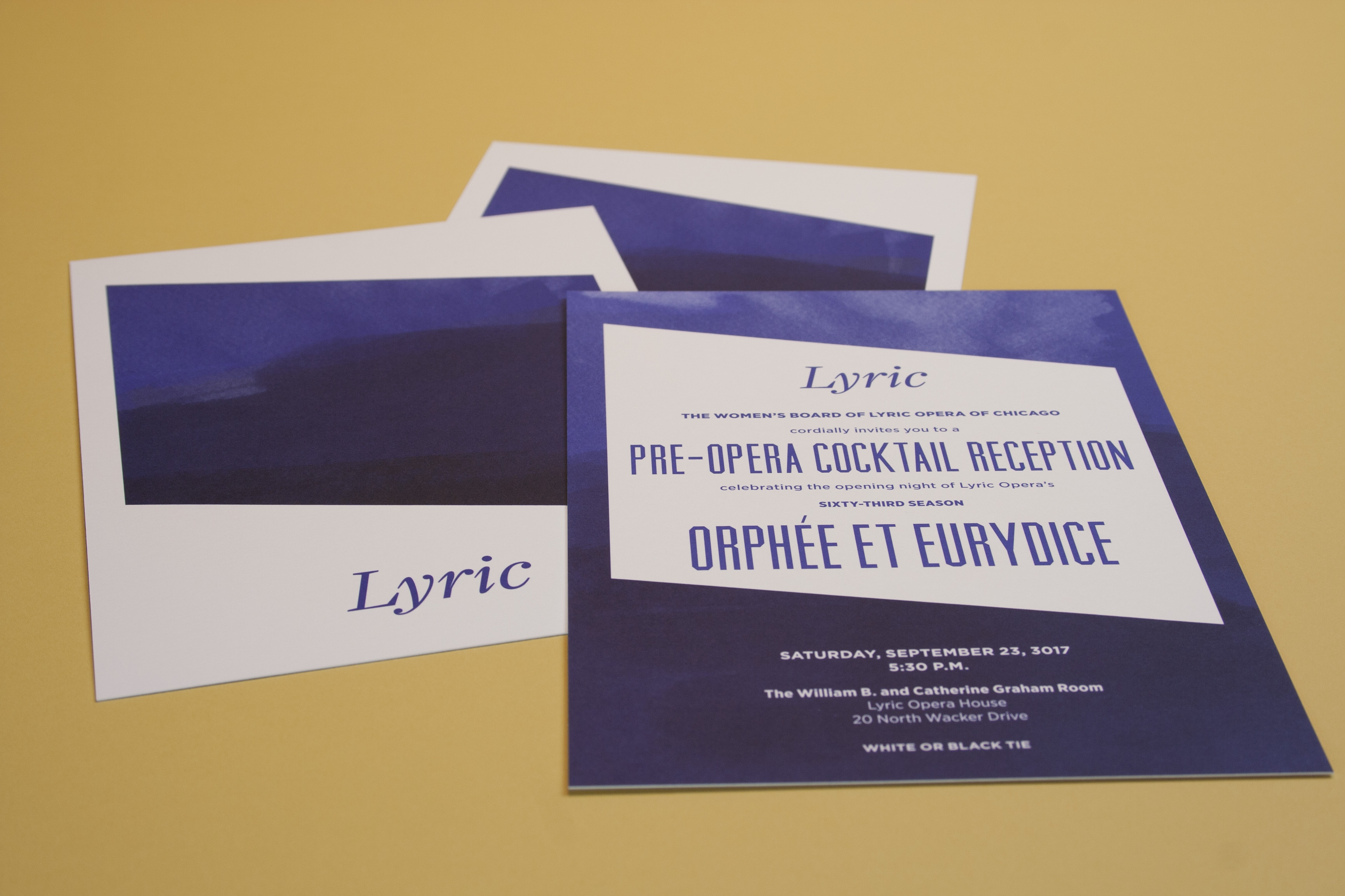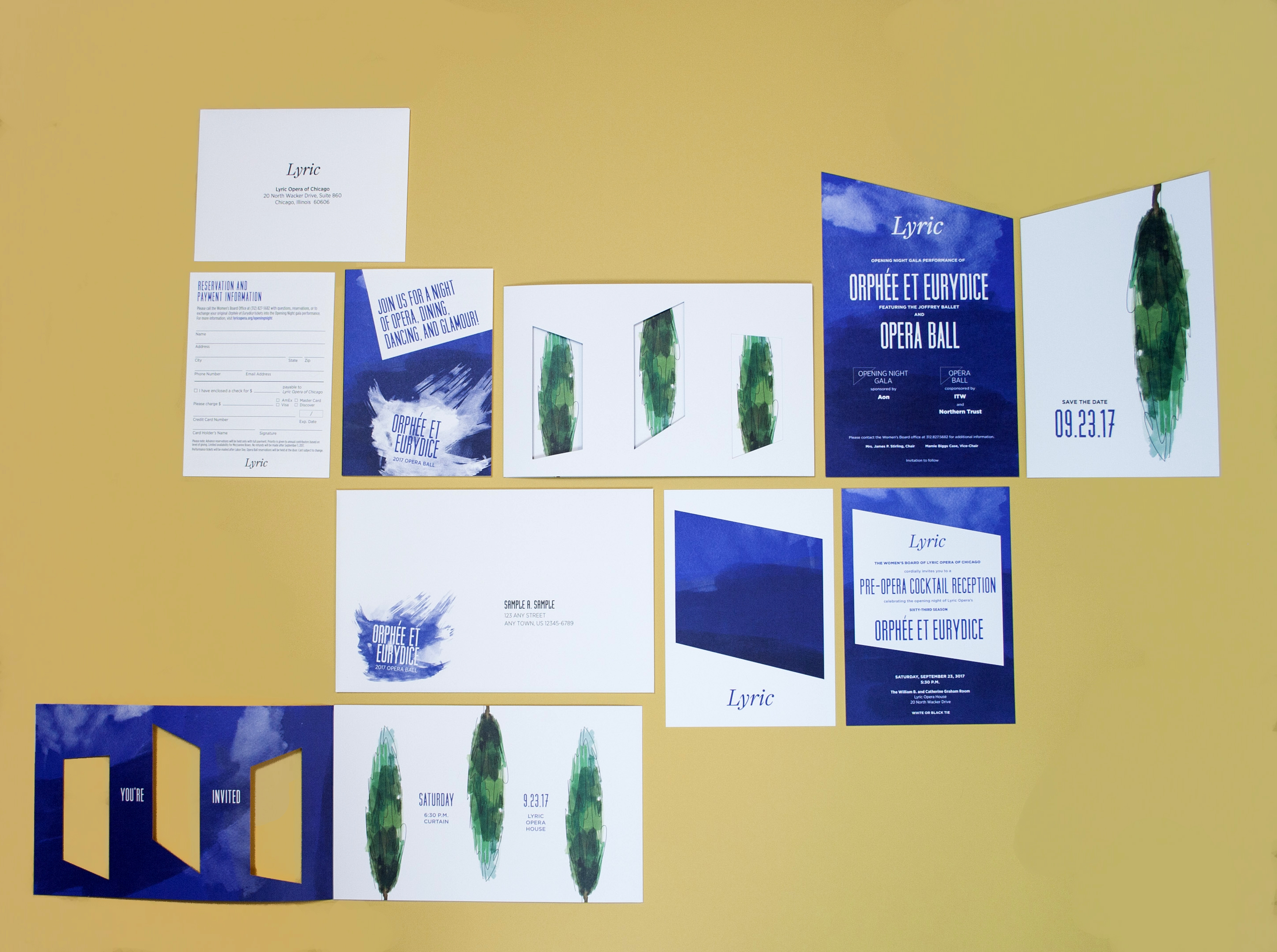 A comprehensive suite of collateral inviting a select group of patrons to the annual Lyric Opera Ball and opening night performance of Orphée et Eurydice. Custom illustrations, logotype and total package designed by me. Utilizing die-cutting and offset printing. Printed at Classic Color.